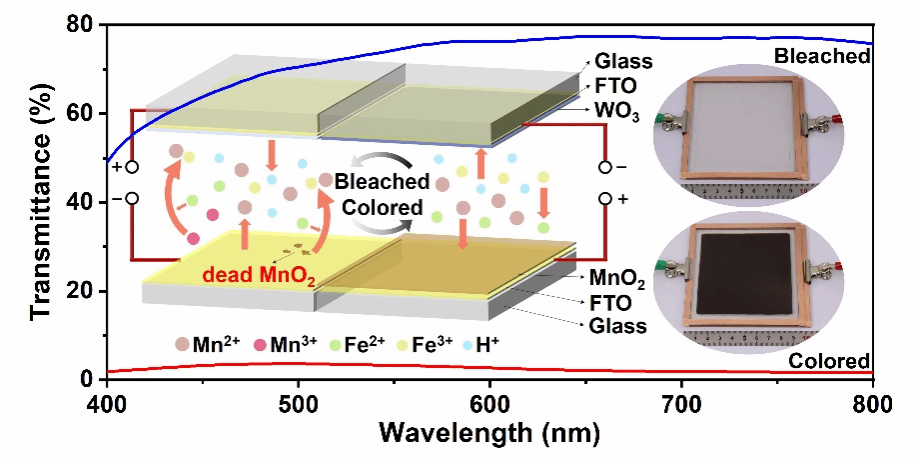 该研究在电致变色器件的开发中取得了重要进展,尤其是在解决MnO2电致变色体系面临的挑战方面。传统上,MnO2体系在可逆电沉积/溶解反应过程中,常常受到“死锰”现象和光学调制范围有限等问题的困扰,这些问题与Jahn-Teller效应密切相关。Jahn-Teller效应会导致MnO2的结构失稳,进而影响其沉积/溶解反应的可逆性和稳定性。为了解决这一问题,研究团队通过在电解液中引入Fe2⁺/Fe3离子对,成功抑制了Jahn-Teller效应,避免了“死锰”的生成。这一创新性措施确保了MnO2在电致变色过程中保持较高的稳定性和可逆性,使得电致变色器件能够长时间高效地工作,且不会因结构破坏而导致性能衰退。基于此,研究团队开发了一种基于WO3作为对电极的互补型电致变色器件,该器件结合了离子插入/脱出与金属氧化物沉积/溶解的机制,进一步提升了电致变色器件的性能。该器件不仅在着色状态下呈现色中性外观,还展现出了高光学对比度67.3%和出色的循环稳定性,能够在100 cm2的大尺寸器件上实现均匀且高效的着色。这些进展表明,通过有效抑制Jahn-Teller效应并优化电致变色材料和器件结构,可以显著提升电致变色器件的性能,拓展其在实际应用中的潜力。