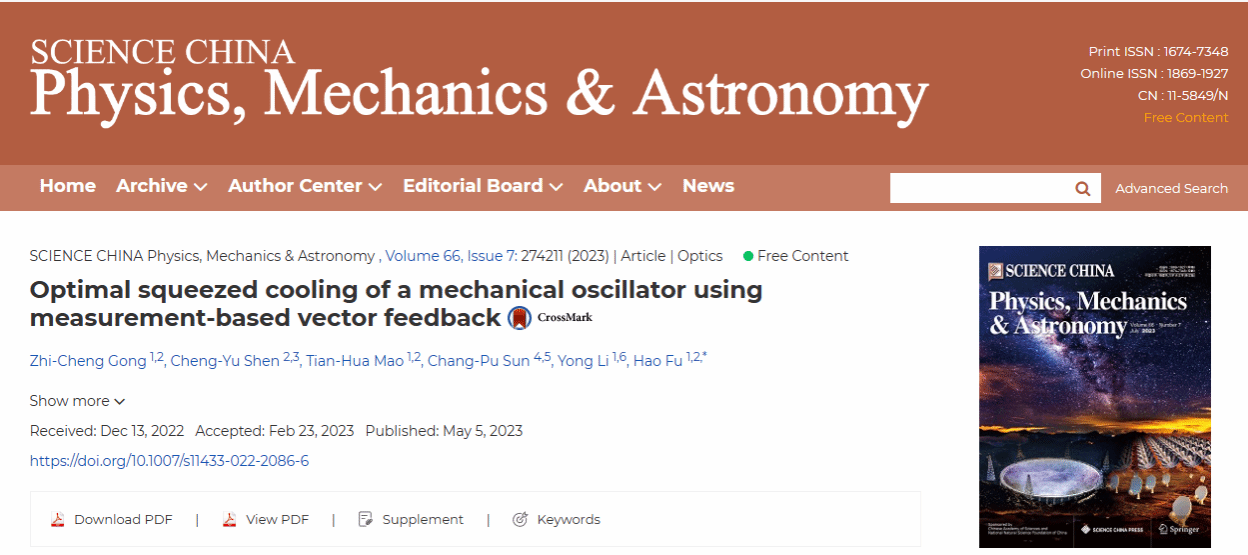 近日,色情游戏 色情游戏 付号研究员与李勇教授团队在国际期刊《SCIENCE CHINA Physics, Mechanics & Astronomy》(JCR Q1,中科院1区Top期刊)发表了题为“Optimal squeezed cooling of a mechanical oscillator using measurement-based vector feedback”的研究论文。