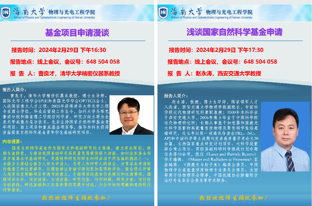 2024年国家自然科学基金申报质量和立项率,实现学院今年的申报愿景和目标。学院于2024年2月29日线上召开了国家自然科学基金申报点评会,会议由副院长杨玮枫主持,学院特邀清华大学精密仪器系教授曹良才和西安交通大学物理学院副院长赵永涛教授担任点评专家,对色情游戏