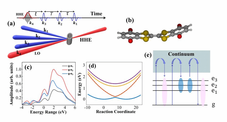 为了检测跨越几个电子伏特能量范围电子波包相干动力学,通常需要宽带EUV光源。在这项工作中,作者提出了在强场下的全光二维(2D)高次谐波回波(HHE)光谱,以检测布居转移和退相干动力学。该工作使用作者自主开发的半微扰方法描述了由一系列非共线序列短脉冲驱动的相干价电子动力学。每个脉冲都能够驱动价态电子电离和回碰从而产生激发态的相干布局,这允许通过高次谐波回波信号直接观察其动力学。作者展示了阴离子分子系统的模拟结果,并表明可以很好地捕捉超快价电子飞秒分辨率动力学。