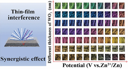 碳纳米管在机械、微电子和光电子等领域有着广泛的应用,但是其固有的黑色外观严重限制了其在智能织物等方面的应用。由于碳纳米管薄膜的化学惰性,传统化学染色方法难在其上产生理想效果。受自然界结构色的启发,研究人员在碳纳米管薄膜上沉积氧化钨制备电致变色电极,通过薄膜干涉的协同效应实现各种颜色。进一步地,使用氯化锌盐包水电解质以及锌箔对电极组装了柔性多彩电致变色器件,该器件具有颜色调制范围广、柔韧性好、稳定性高等优点。这项工作不仅实现了碳纳米管纤维薄膜的着色,还获得了宽范围动态调节的多彩电致变色效果,为未来嵌入式可穿戴电子设备、智能纺织品和功能涂层的发展应用提供了新思路。