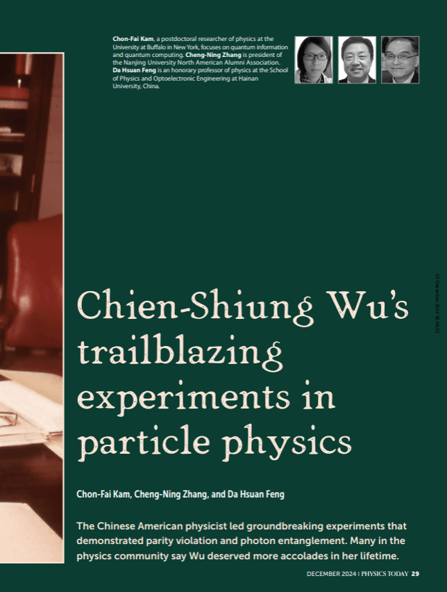 荣誉教授冯达旋,与甘俊辉、张程宁共同撰写的论文《吴健雄在粒子物理学中的开创性实验》(Chien-Shiung Wu's trailblazing experiments in particle physics) 正式刊登在全球顶级物理学期刊《Physics Today》的封面上。该文回顾了华裔物理学家吴健雄在粒子物理学领域的卓越贡献,特别是她在量子纠缠现象和宇称不守恒实验中的开创性研究。这些开创性的工作不仅为量子物理学的发展奠定了坚实基础,也使吴健雄成为全球物理学界的重要人物。期刊编辑部特别选用了吴健雄的肖像作为《Physics Today》2024年12月刊的封面人物,进一步彰显了她在科学史上的深远影响。