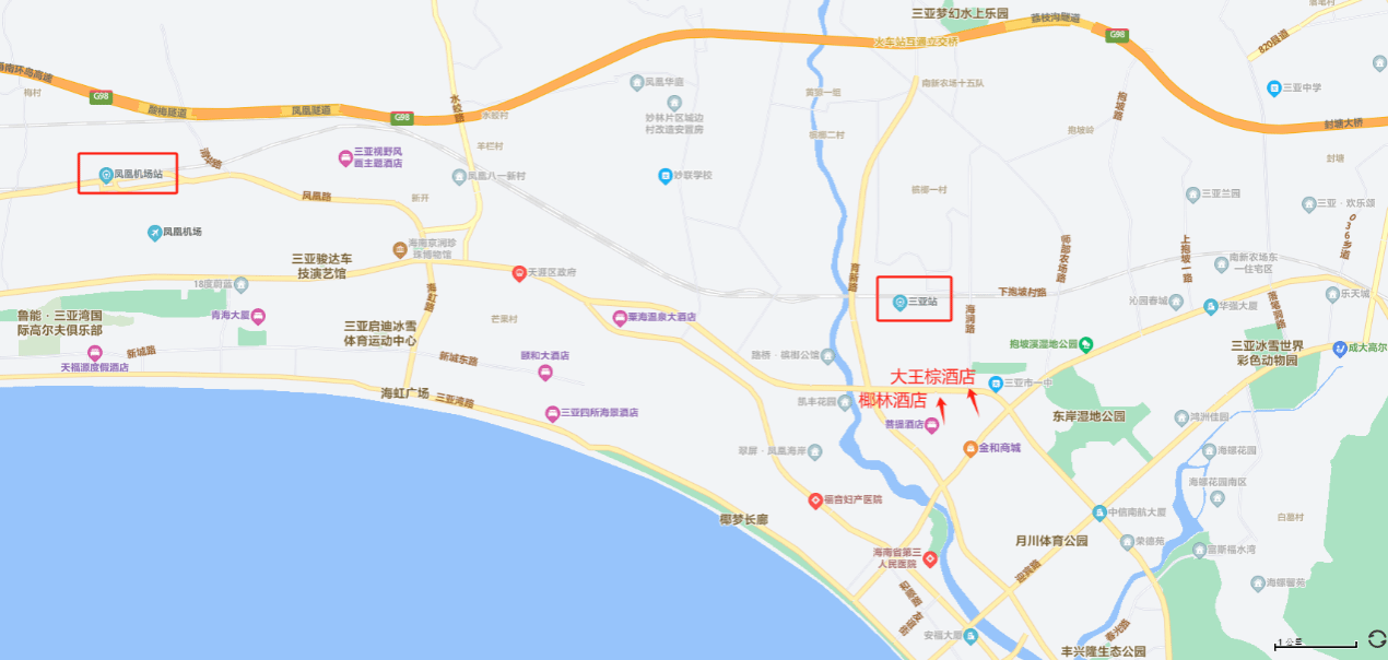 会议酒店位于三亚湾,紧挨三亚凤凰机场,西边海坡度假区,东临港口,附近有3个临海广场和一个滨海公园,环境优美,交通便利,参会者可通过以下交通方式前往会议酒店: