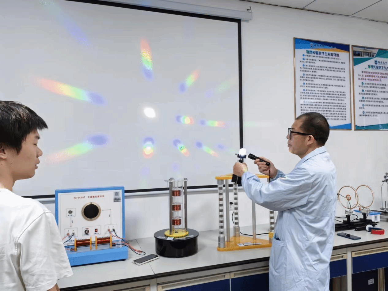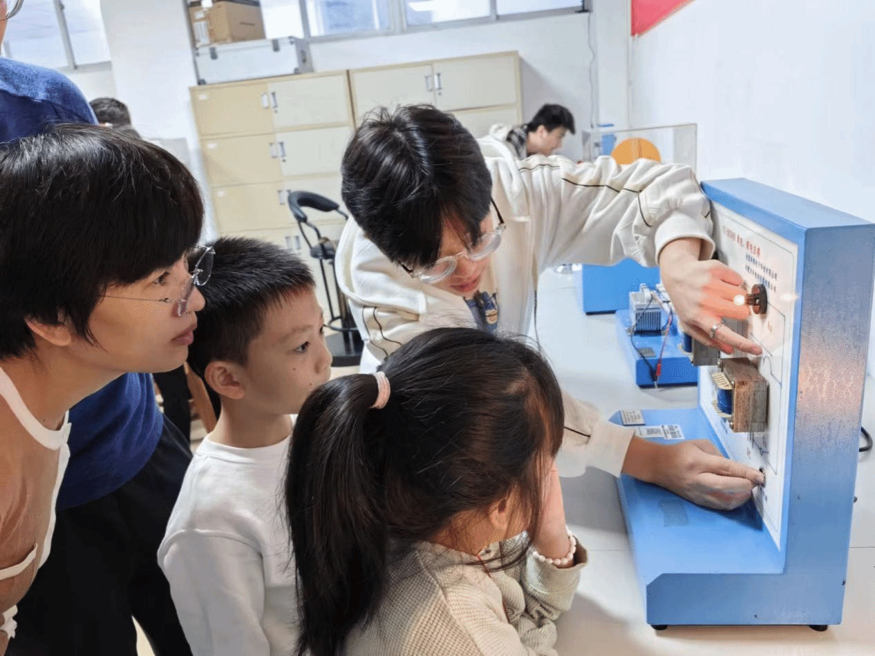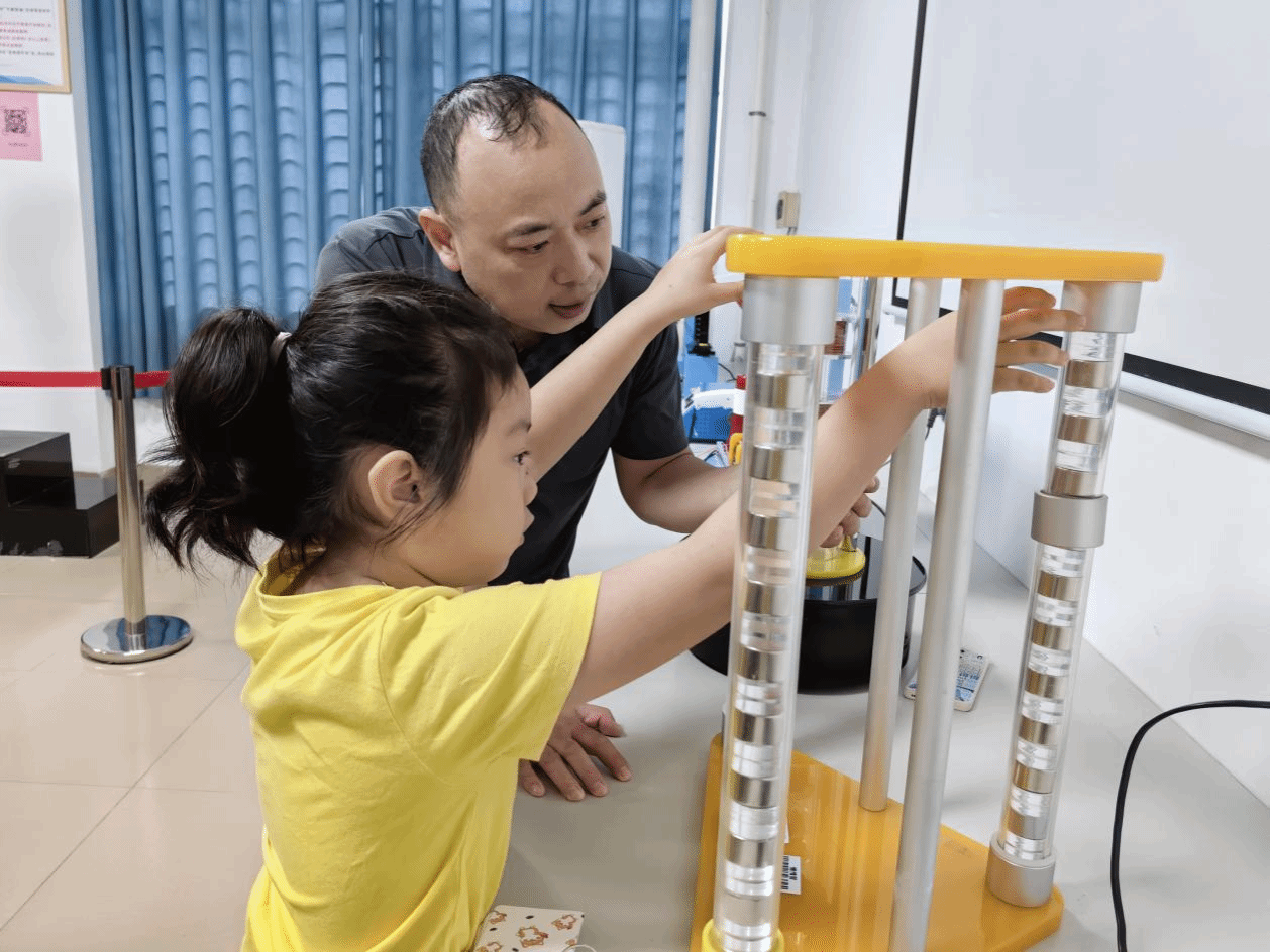 在活动现场,基础物理实验教学中心主任陈文钦老师给学生们讲解科普知识,用科普的火种点燃小朋友们的科技梦,随后带领小朋友们体验很多有趣的科学实验通过沉浸式体验大家了解到许多生活中的科学现象,解密科学原理同时也感受了“声、光、磁、电、机械”带来的视觉和听觉盛宴